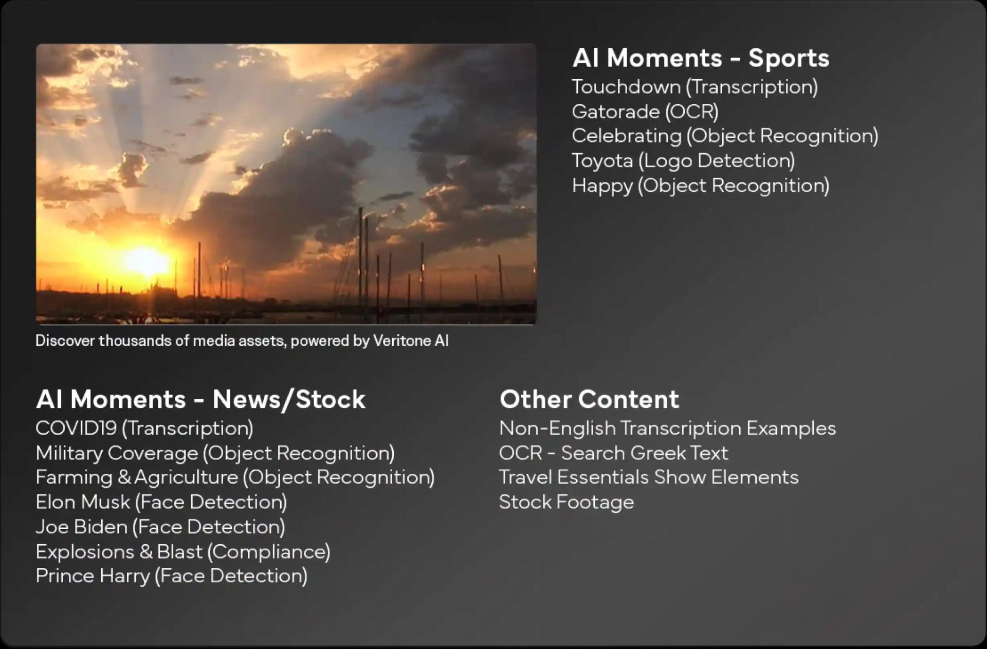 By combining human expertise with an AI-powered approach, Veritone is revolutionizing media management through an intelligent, user-friendly solution that offers improved visibility and search capabilities — helping you extract greater value from your existing content investments.