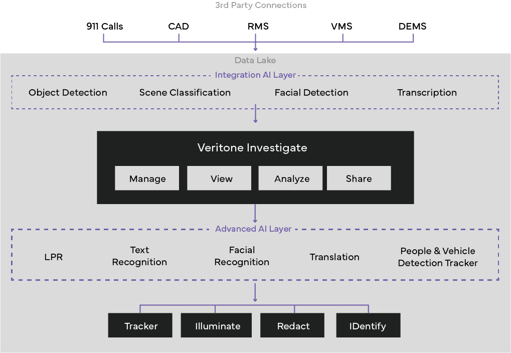 Veritone Investigate is at the heart of the iDEMS suite, providing a customizable user interface and serving as the central evidence hub to store, manage, analyze, and share all digital evidence files. You can connect it to your cloud-based or on-premise data sources (such as 911 and video management systems). Then, you can ingest any type of media file (such as body-worn camera footage, surveillance footage, jailhouse call, etc.) to leverage primary and advanced AI models to catalog and tag unstructured data within audio, video, and PDF evidence files, leading to actionable insights.